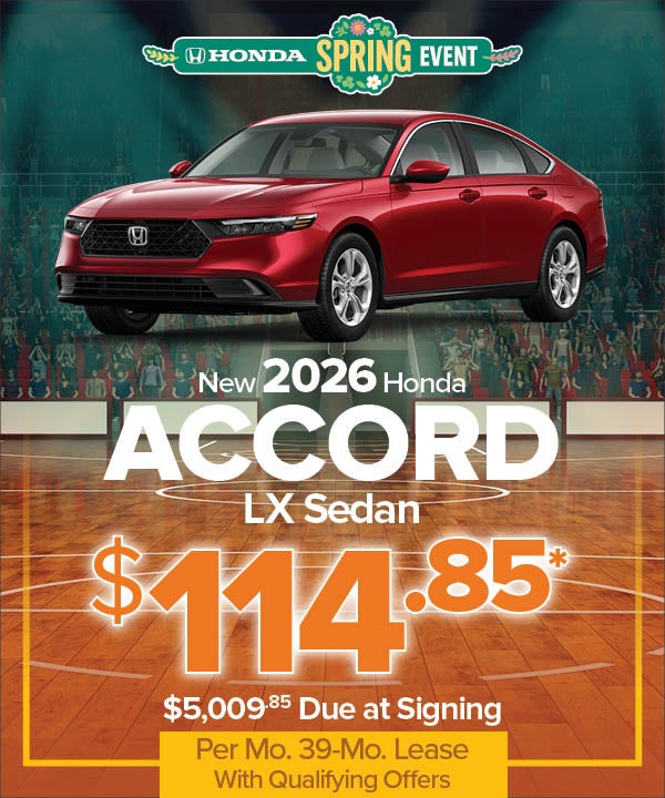 VIN# TA005411, auto. MSRP $29,590. $5,013.85 total due at lease signing ($3,900 cash down + $995 bank fee + 1st payment). Cap cost reduction, $4,900. TTL Lease/TTL Cost/Residual: $4,479.15/$9,374.15/$22,192.50. No security deposit required. Price(s) include(s) all costs to be paid by a consumer, except for licensing costs, registration fees, and taxes. Dealer doc fee of $999 not included in price. On approved credit through Visions FCU. Residency restrictions may apply. Lease include 7.5K miles per year/$.20 per mile thereafter. $450 lease termination fee due at lease end. $1,000 Loyalty/Conquest Offer available toward cap cost reduction with the lease of a new 2026 Accord available to current owners of any 2011 or newer Honda, Chevrolet, Ford, Hyundai, Jeep, Kia, Mazda, Nissan, Subaru, Tesla, Toyota and Volkswagen vehicles. Photos are for illustration purposes only. Offer expires 3/31/2026.