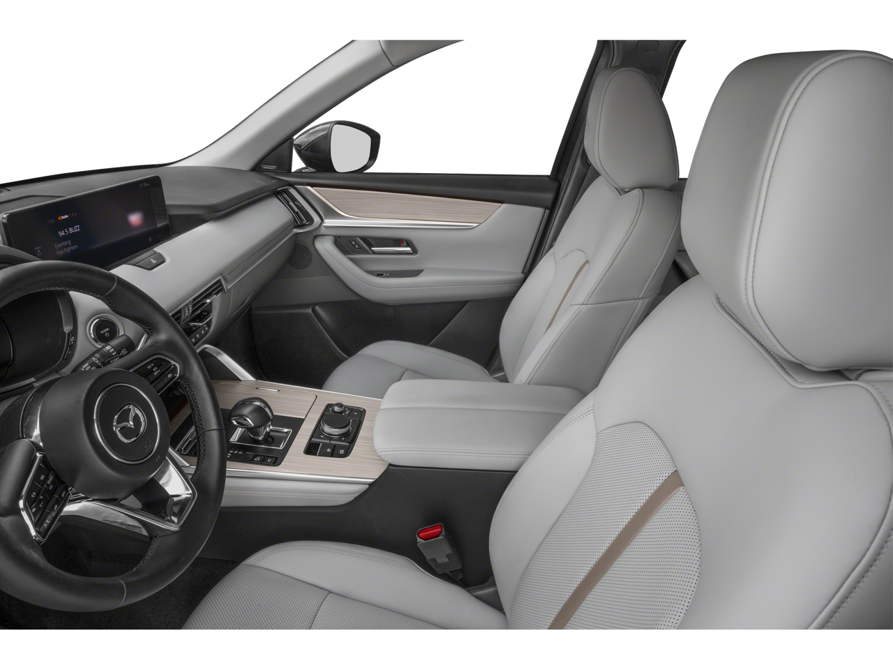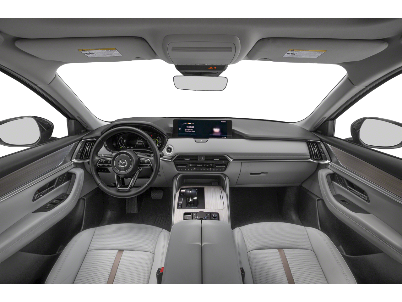Leather Seats, Third Row Seat, Navigation, Sunroof, Panoramic Roof, All Wheel Drive, Quad Bucket Seats, Power Liftgate, Rear Air, Heated Driver Seat, Heated Rear Seat, Cooled Driver Seat, Back-Up Camera, Premium Sound System, Satellite Radio Mazda CX-90 PHEV Premium Plus with Sonic Silver exterior and White interior features a 4 Cylinder Engine with 323 HP at 6000 RPM*. Rear Spoiler, MP3 Player, Privacy Glass, Keyless Entry, Remote Trunk Release.